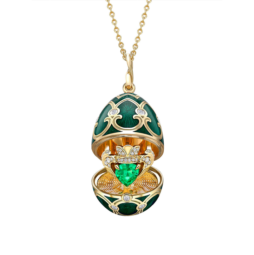 For this piece, Fabergé is working with what is arguably one of the most iconic designs to ever come from Ireland, the Claddagh Ring. The creation is a very special egg surprise pendant, which features 18ct yellow gold and green guilloche vitreous enamel, 15 round brilliant cut white diamonds, with a heart-shaped Gemfields Zambian emerald at its centre, and an 18ct yellow gold trace chain with an egg tag.