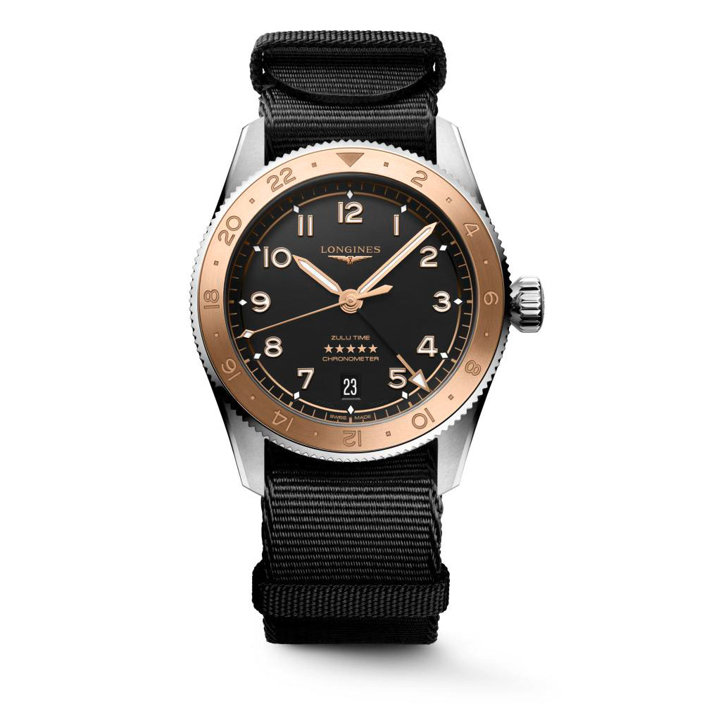 Gents Longines Spirit Zulu Time 1925 Auto 39mm GMT Date Steel Rose GoldBlack Dial