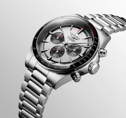 CONQUEST watch with a stainless steel and ceramic bezel, a silver dial, and a stainless steel bracelet. This watch has a chronograph function and a column wheel mechanism. The dial has black totalizers for the chronograph functions.