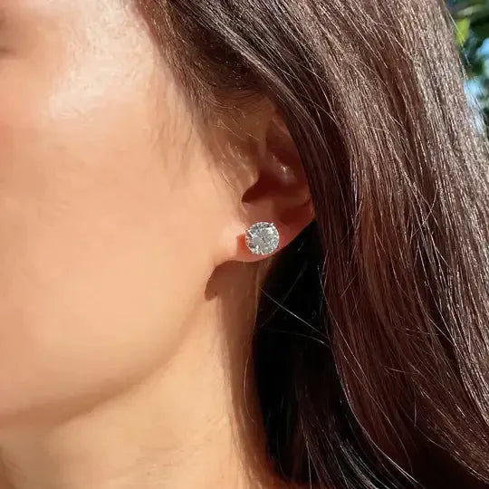 A timeless staple. These round brilliant stud earrings are mounted on a tapered basket to get the flush look when worn. The post of each earring has a double notch to allow for greater comfort and fit. EACH STONE 2.0CT SIZE