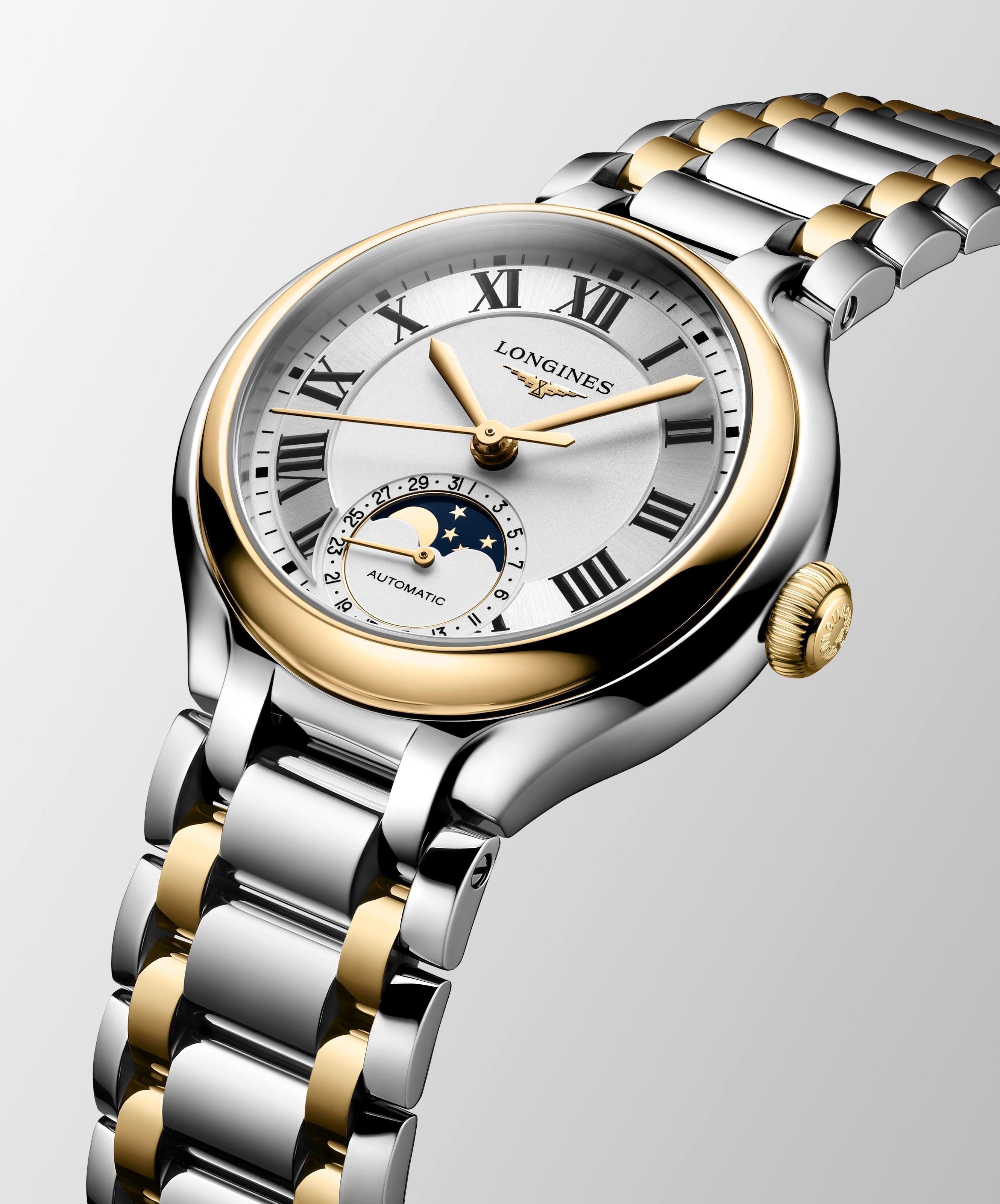Ladies Longines Prima luna Moonphase Auto 34mm Steel & 18ct Yellow Gold Cap 200 Silver Dial