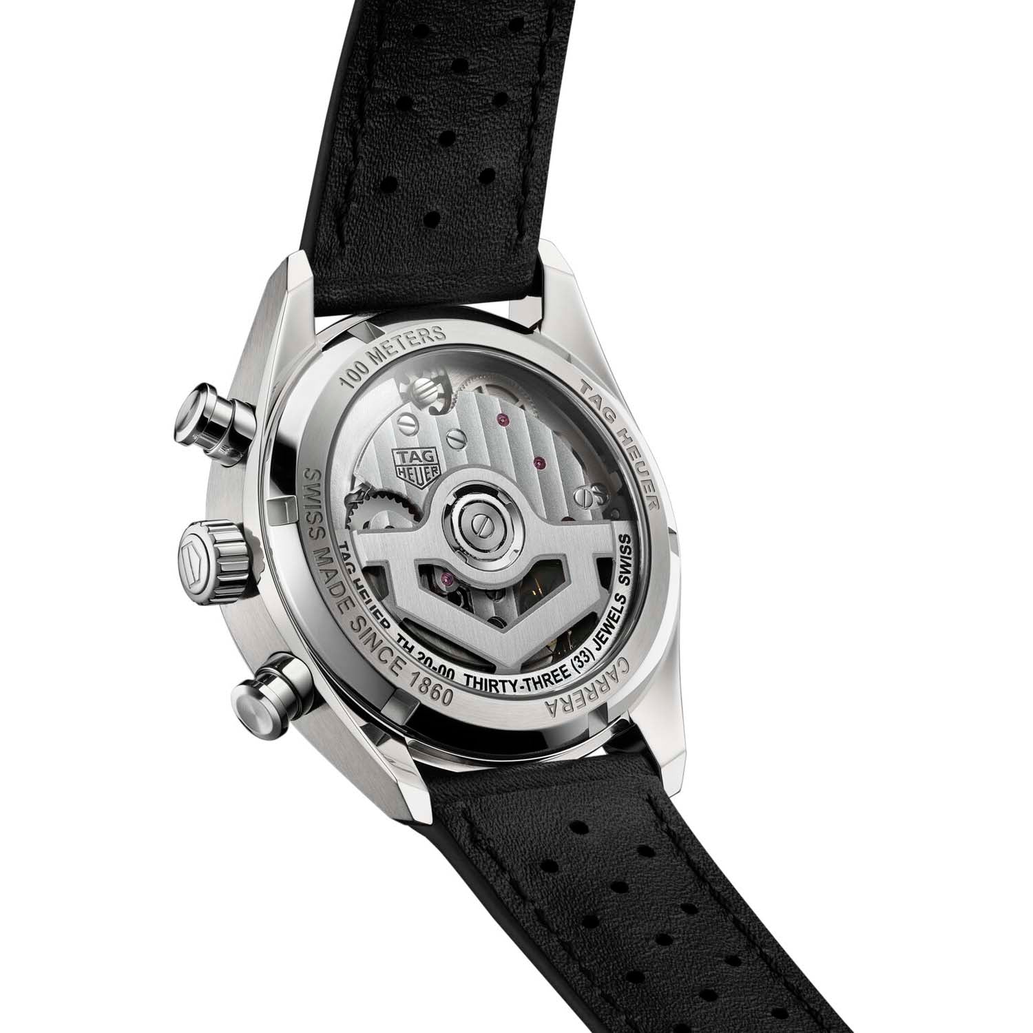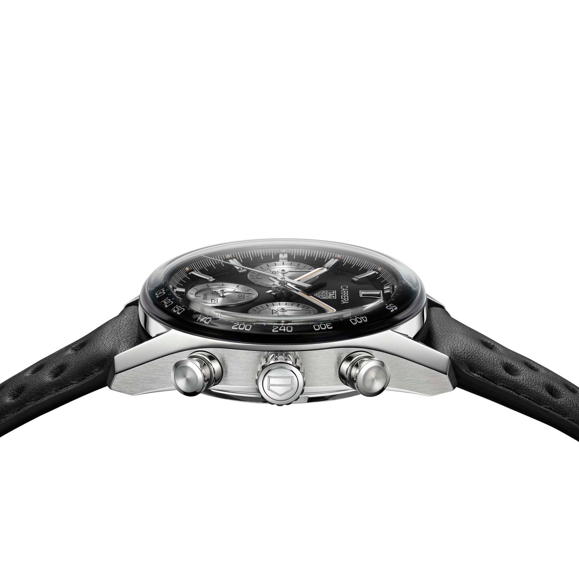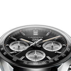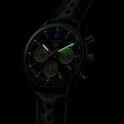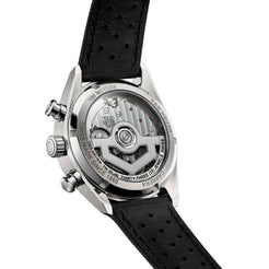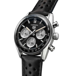 Reimagined from the reverse panda 2447 NS model, this prestigious black 39mm version of the TAG Heuer glass box encapsulates the Carreras signature design with a modern twist. With its luxurious perforated calfskin leather strap, this watch is resolutely driven to dare.
