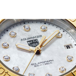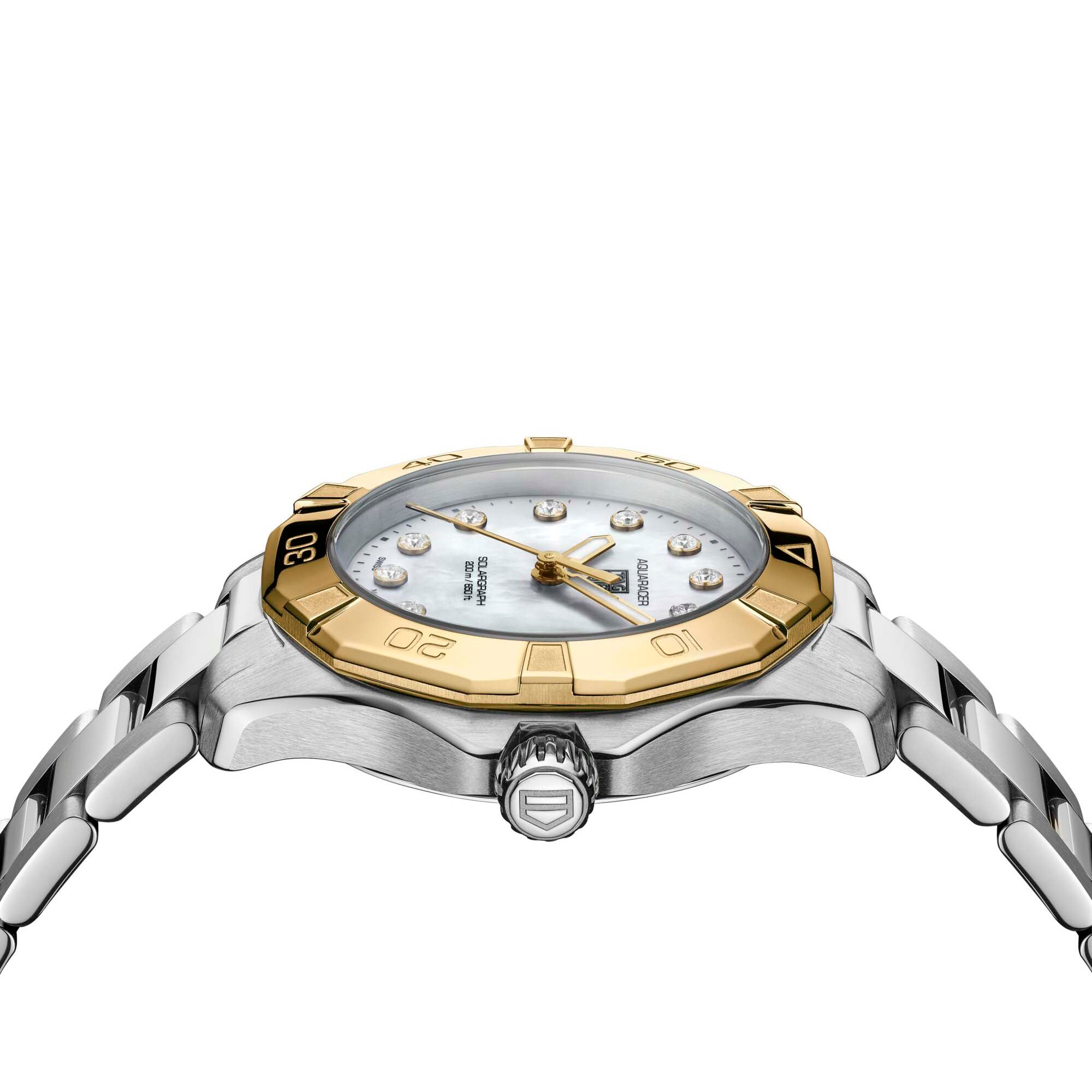 The TAG Heuer Aquaracer Professional 200 Solargraph in 34 mm merges elegance and resilience, featuring a steel and 18K 2N yellow gold design and adorned with diamonds on its mother-of-pearl dial. Equipped with the Solargraph Calibre TH50-01, the timepiece is powered by any light source. The perfect companion for urban settings or outdoor adventures.
