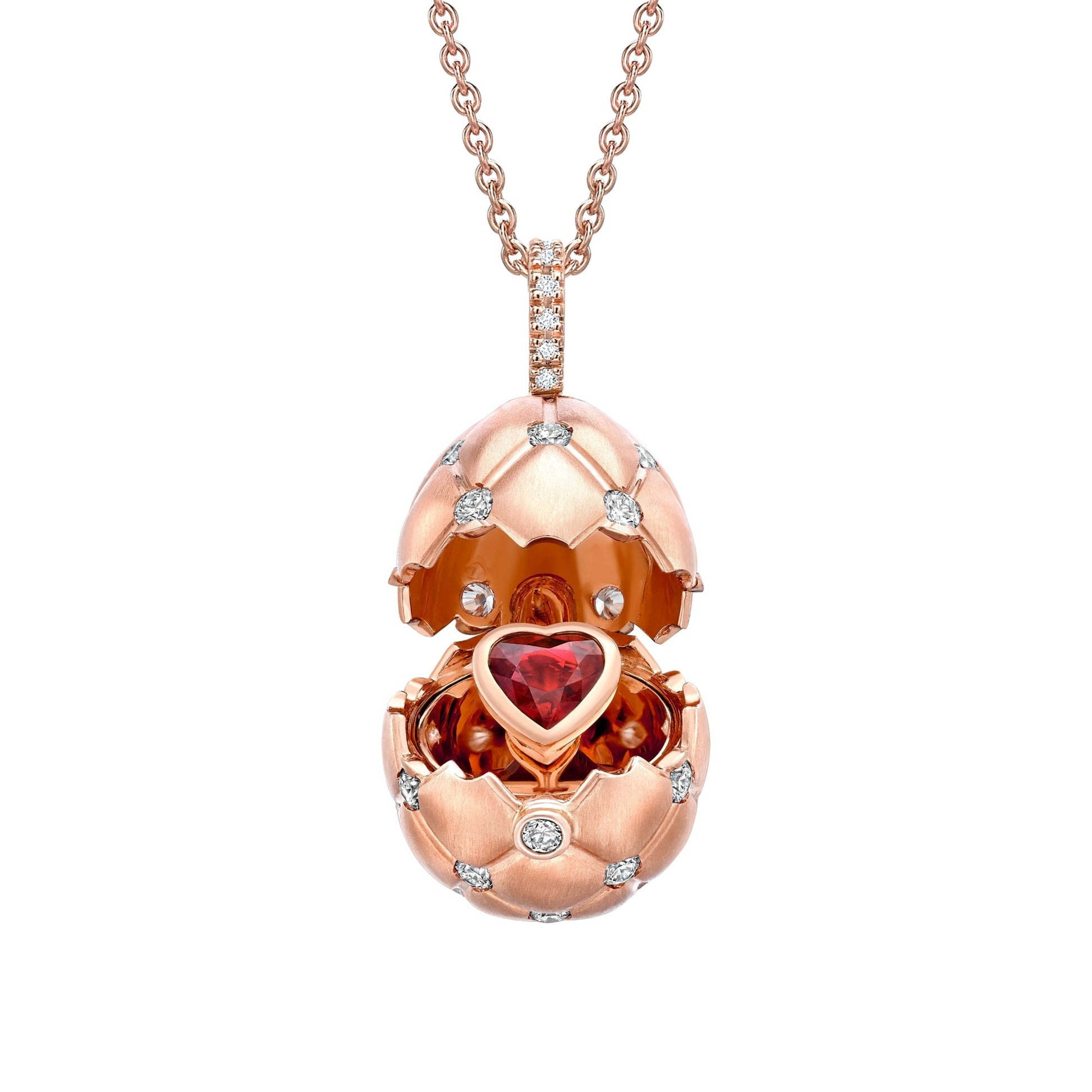 Faberge Treillage 18ct Rose Gold Diamond Ruby Heart Surprise Egg Pendant 1698FP3388/16.The Treillage Collection is in...