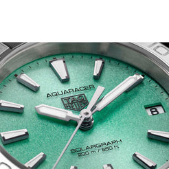 Go further than ever with this polar blue-accented TAG Heuer Aquaracer. Its turquoise sunray brushed dial, enhanced with Super-LumiNova®, ensures maximal legibility in all conditions. Equipped with a 34 mm steel case and bracelet, water-resistant to 200 meters, it’s a versatile choice for the modern explorer.