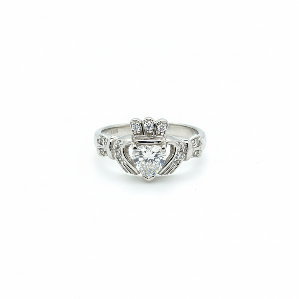 18ct White Gold Diamond Set Claddagh Ring Crafted entirely in house here in our Galway workshop this unique piece incorporates a heart shaped natural diamond with the hands and crown adorned with round brilliant cut diamonds.