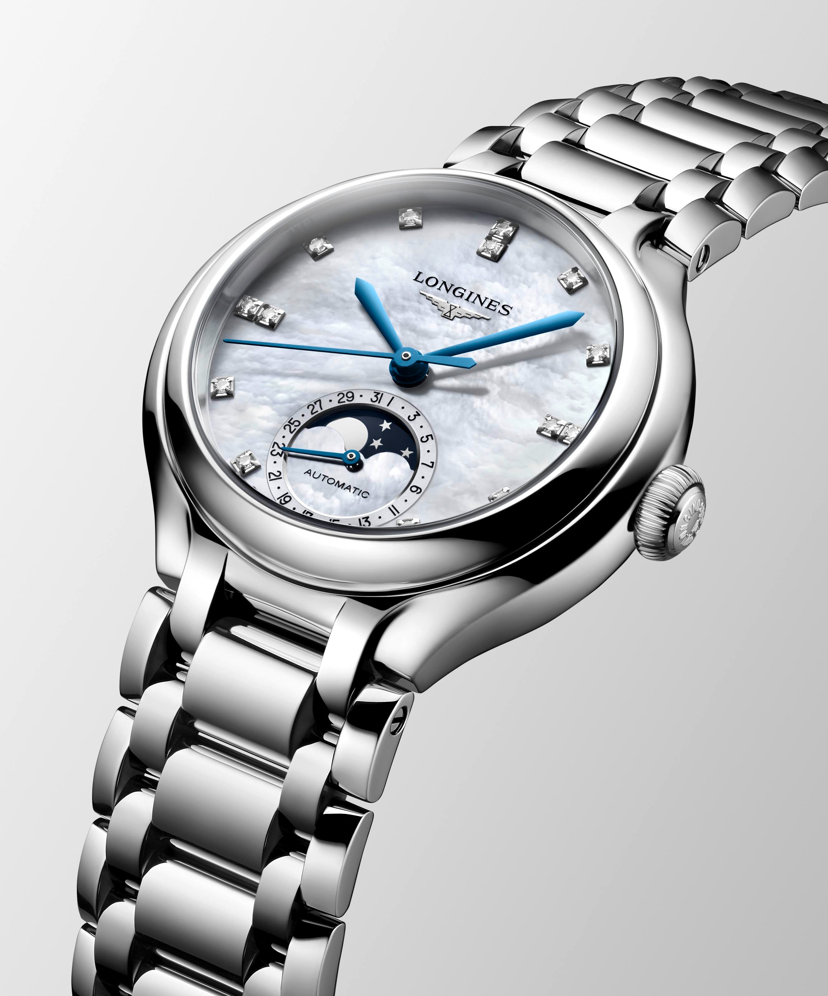Ladies Longines Prima Luna 34mm Moonphase Steel MOP Dia Dial