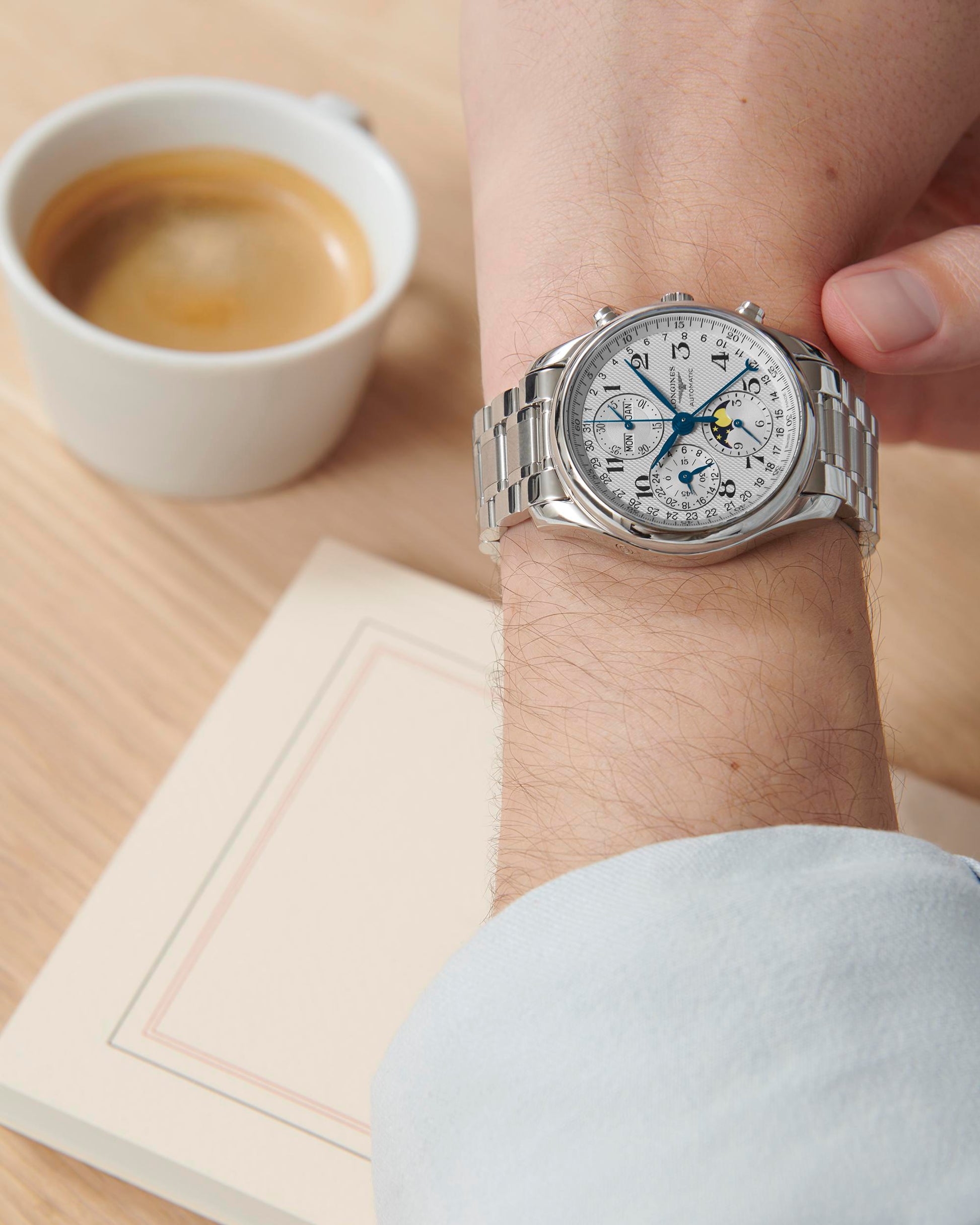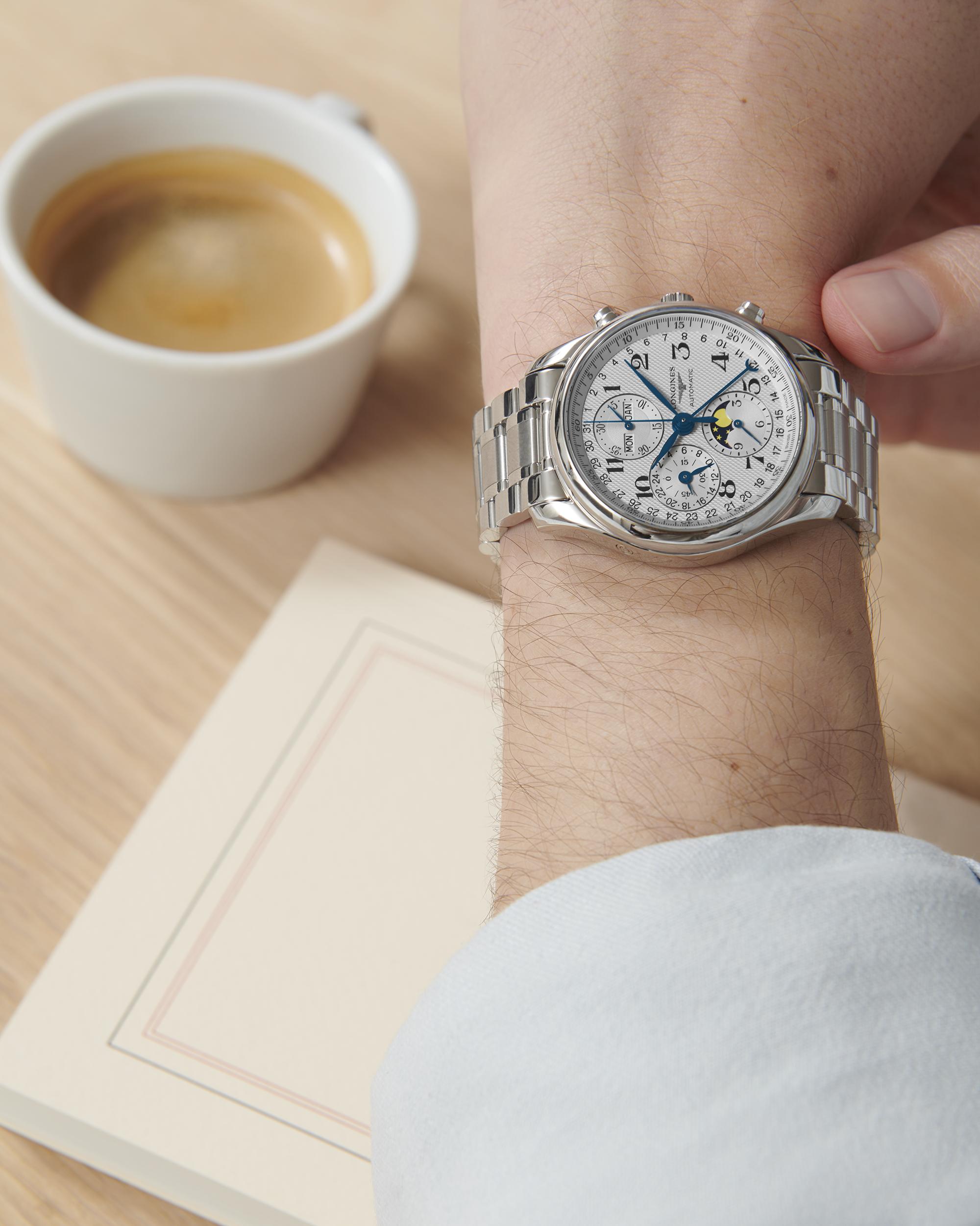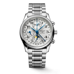 Gents Longines Master Collection Automatic Chronograph Moonphase 40mm Steel Bracelet and Case Silver Barlycorn Dial with Arabic Numeral