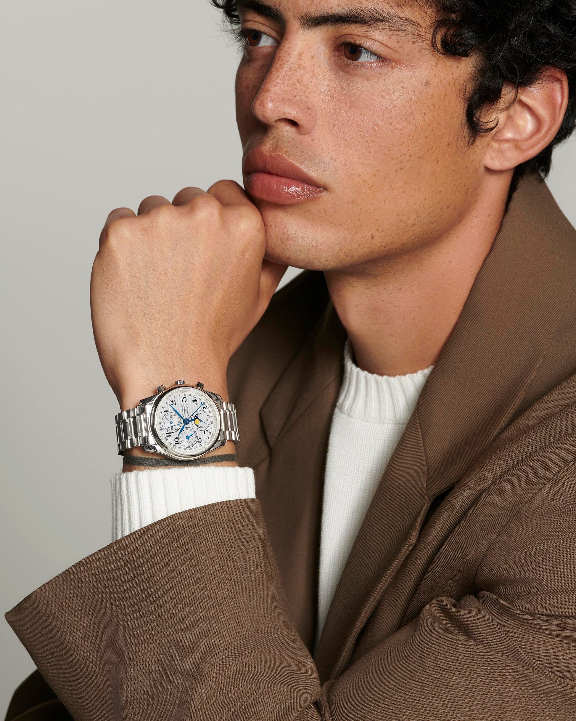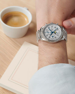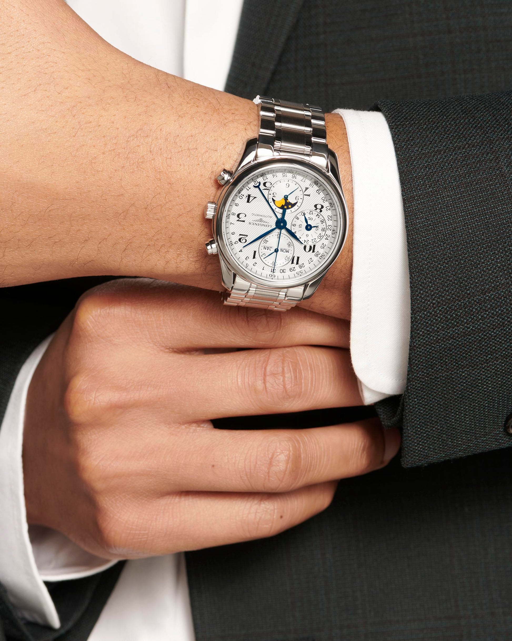Gents Longines Master Collection Automatic Chronograph Moonphase 40mm Steel Bracelet and Case Silver Barlycorn Dial with Arabic Numerals