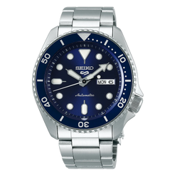 Gents Seiko 5 Automatic 42.5mm Day Date Steel Bracelet Blue Dial and Bezel