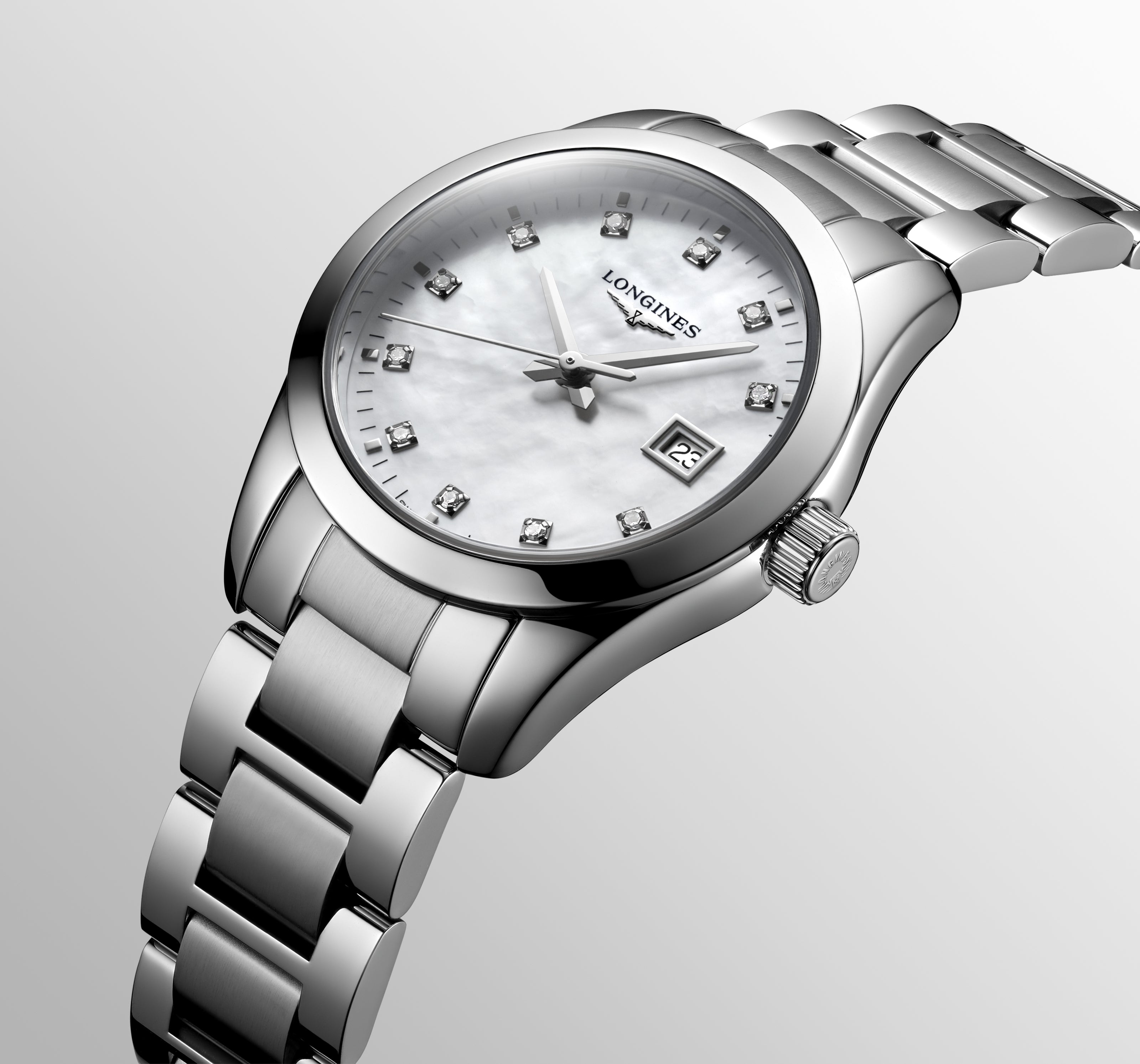 Ladies Longines Conquest Classic 29.5mm Steel Bracelet White Mother of Pearl Diamond Dial Date 50m