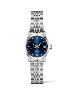 This Ladies Longines Record collection - L2.320.4.96.6 watch has a 26mm stainless steel case.This model also features an automatic movement, sapphire crystal, Sunray Blue dial and a stainless steel Bracelet. It has a water resistance of 30m.