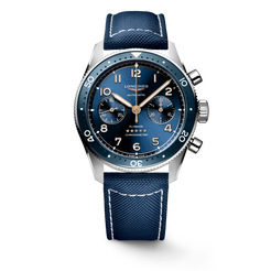 LONGINES SPIRIT FLYBACK watch with a stainless steel and ceramic bezel, a sunray black dial, and a stainless steel br...