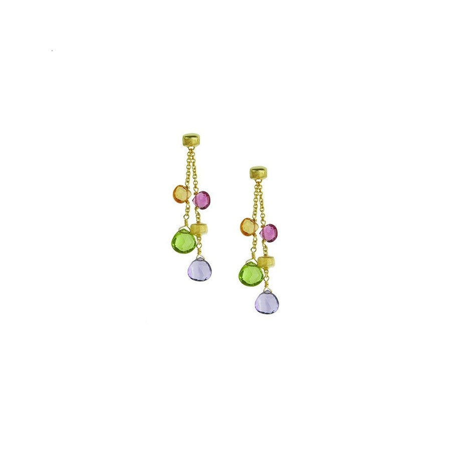 Escape to paradise with these stunning Marco Bicego earrings. Hand-engraved in 18ct yellow gold, they feature two delicate strands adorned with a kaleidoscope of shimmering gemstones.
