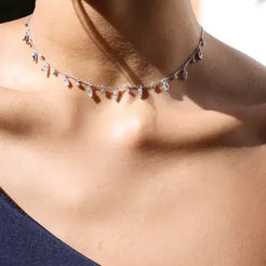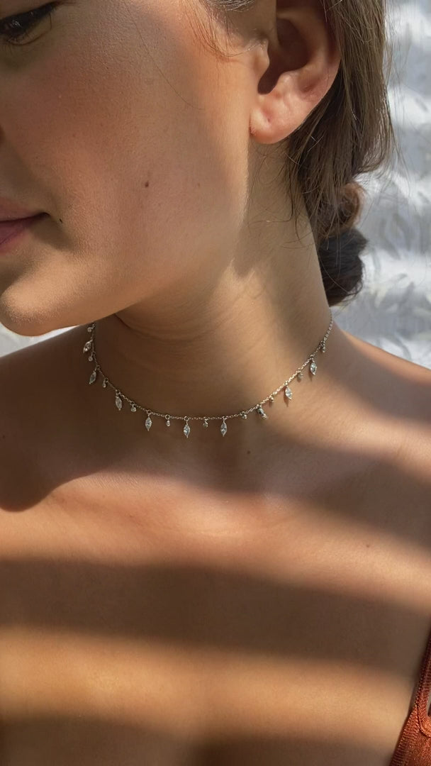 A stunning delicate necklace comprised of alternating marquise and round brilliant stones. Wear above the collarbones in a choker style. Complete with a slider closure for a fully adjustable fit.