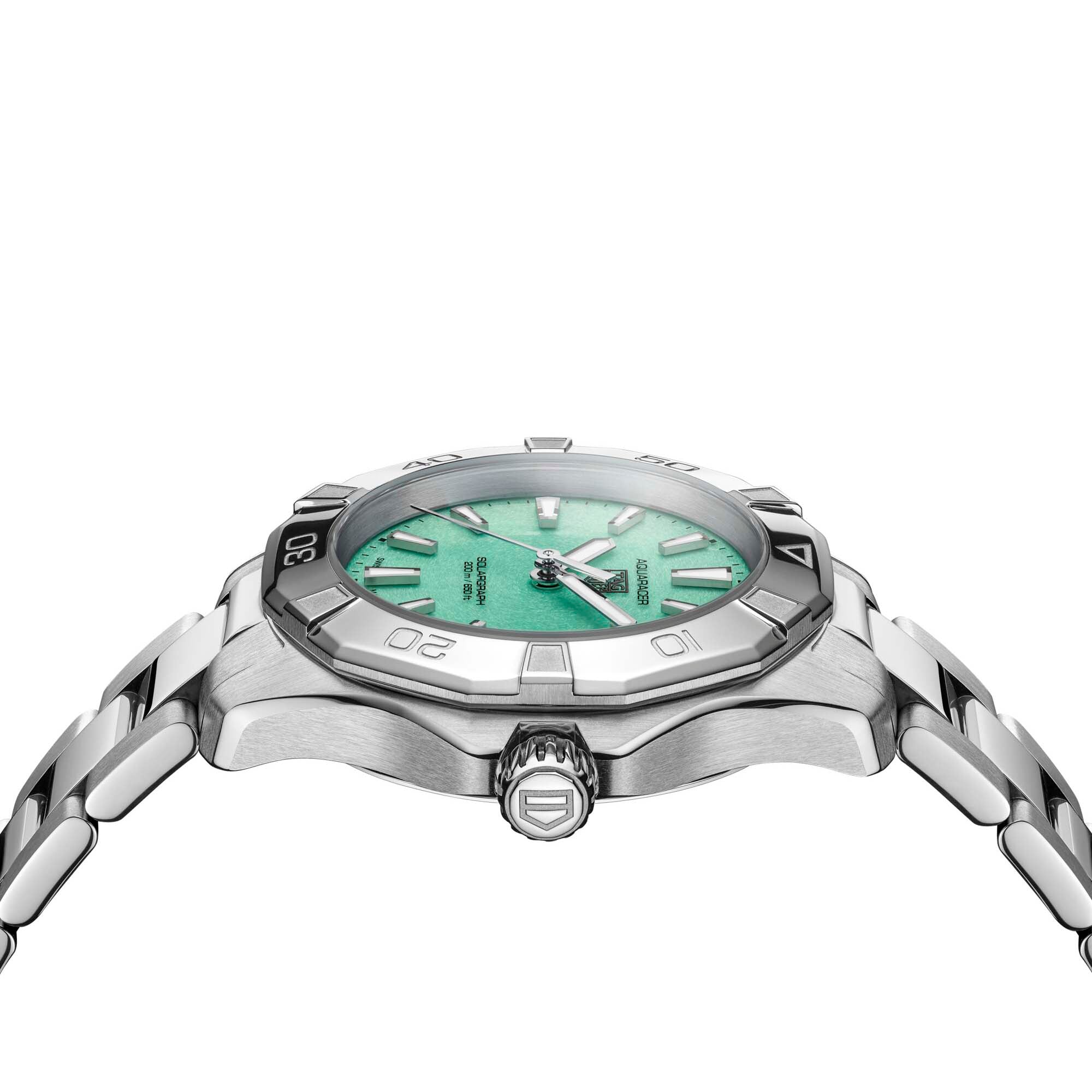 Go further than ever with this polar blue-accented TAG Heuer Aquaracer. Its turquoise sunray brushed dial, enhanced with Super-LumiNova®, ensures maximal legibility in all conditions. Equipped with a 34 mm steel case and bracelet, water-resistant to 200 meters, it’s a versatile choice for the modern explorer.