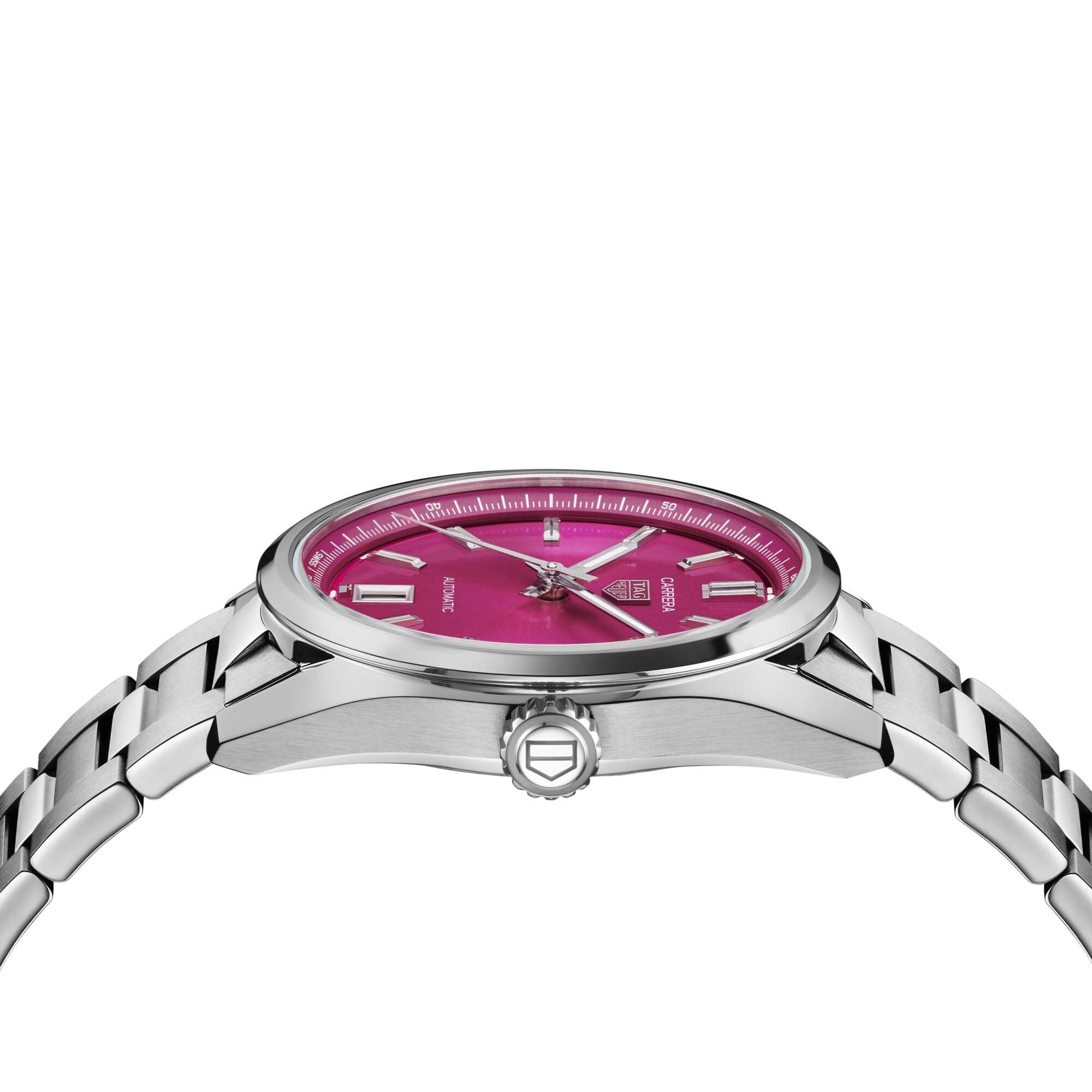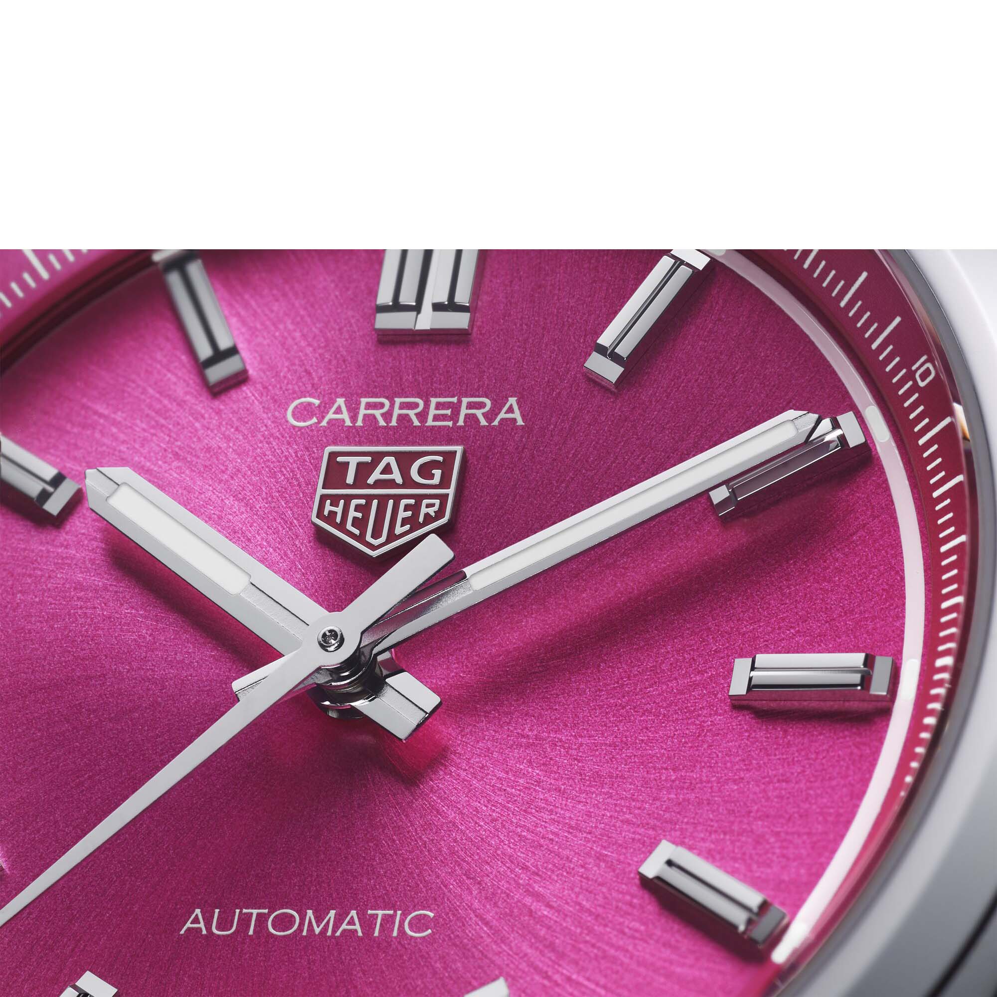 Unmistakably adorned with a vivid snailed pink dial, this striking TAG Heuer Carrera distils its strong personality with panache. An elegant fine brushed stainless steel case and water-resistant to 50 metres, this daring watch is the unstoppable ally of any achievement.