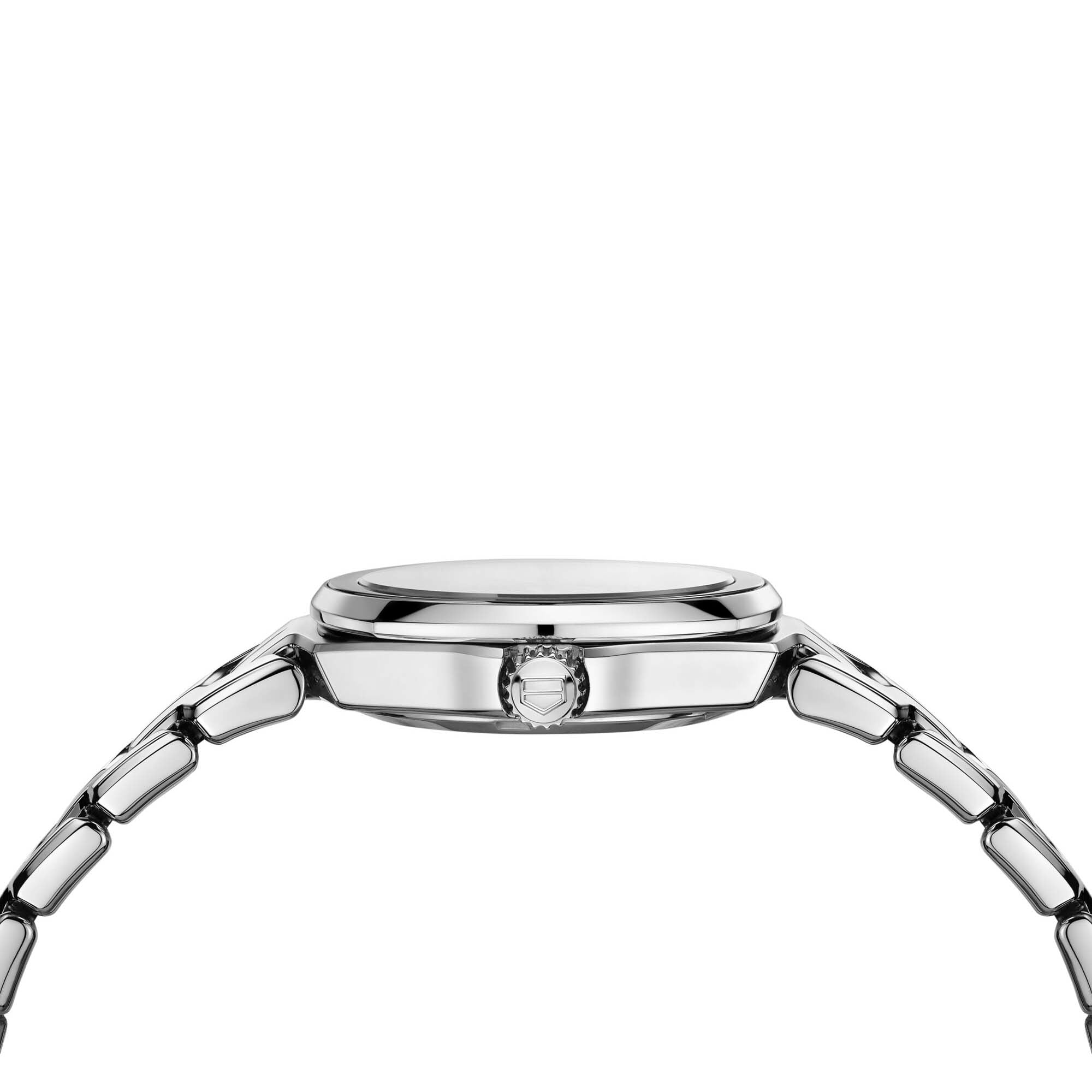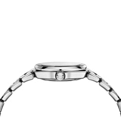 A sleek and slender, 32mm steel-cased Link Quartz with rose-gold plated hands and logo on a sunburst taupe dial. The ...