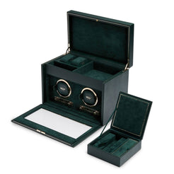 • Storage: 2 winding modules, 2pc watch storage with suspended cushions (cuff will accommodate up to 52mm case) 1 open compartment, travel case (1pc watch storage, 1 lidded compartment)
